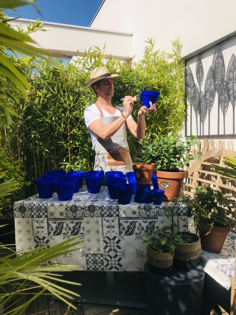 Envouté par ce bleu perçant, reconnaissable entre mille, Jérôme Servant livre, dans cette collection de pots en terre cuite, un heureux hommage aux jardins d’Yves Saint-Laurent et Pierre Bergé.